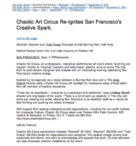 By 2001, CAC was the thing—the vision fully being realized. The third ChaoticArtCircus was locked. The infrastructure teams were ready. The band and performers were excited. Everything was converging for the October 5, 2001 performance. Then…
